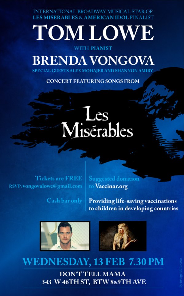 Don’t Tell Mamas, New York Les Miserables Recital with singer Tom Lowe and pianist Brenda Vongova – Benefit for Vaccinar (February 2013)
