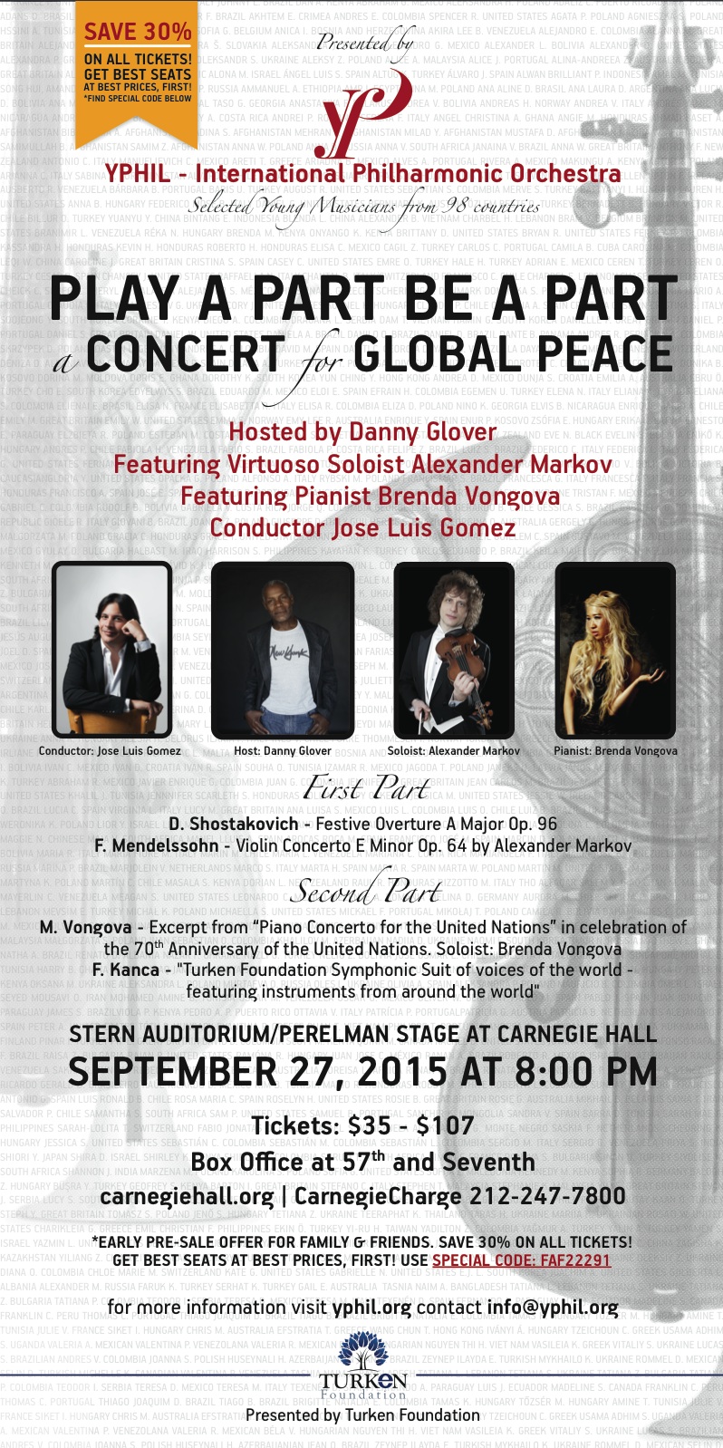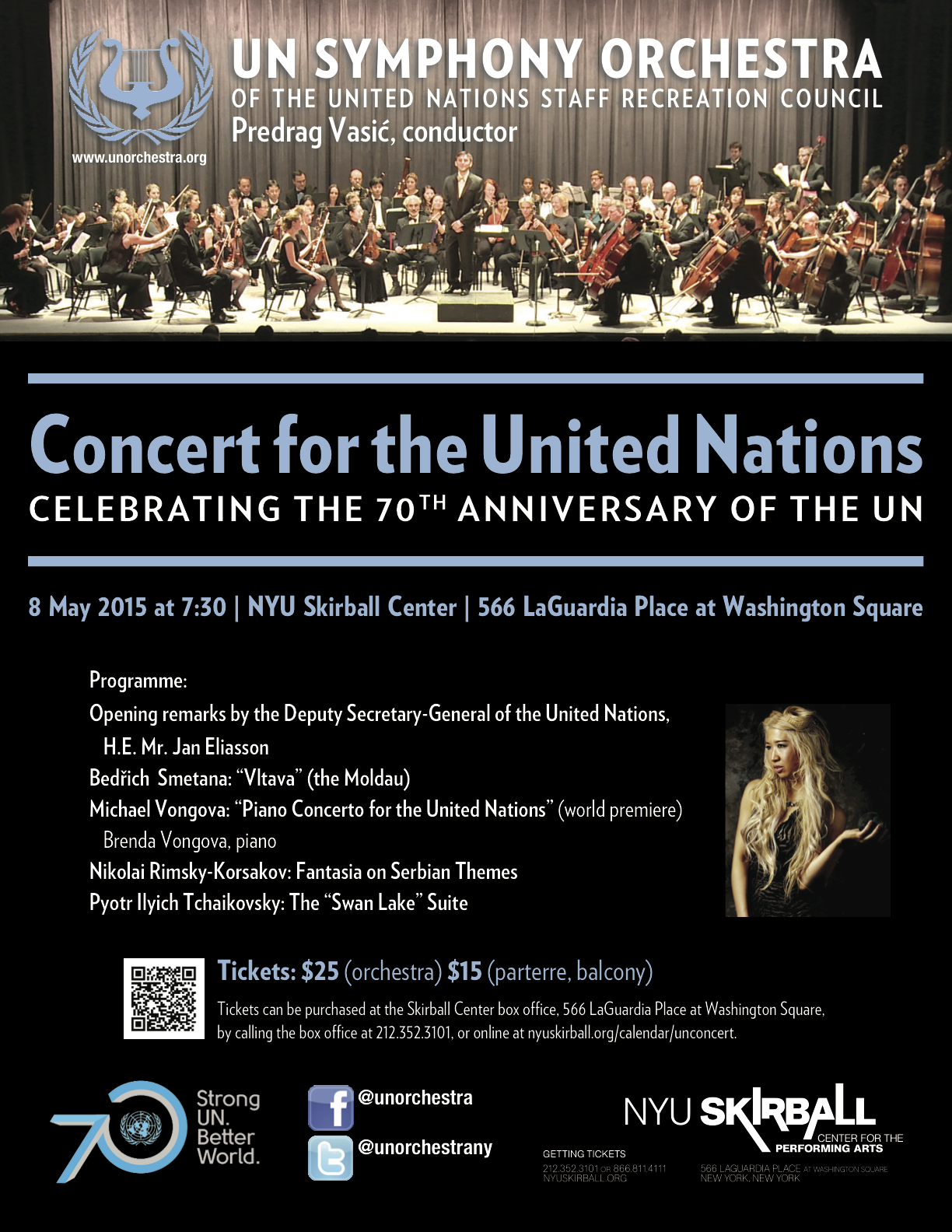United Nations Symphony Orchestra, NY Piano Soloist, World Premiere of the Piano Concerto for the United Nations (in celebration of the 70th anniversary of the United Nations) (8 May 2015)